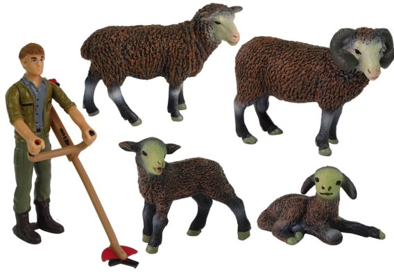 W zestawie znajdziemy Zagrodę z otwieraną furtką, rolnika z kosą spalinową, rodzinę owiec w tym dorosłą owce, barana i dwie młodziutkie owieczki oraz belę słomy.