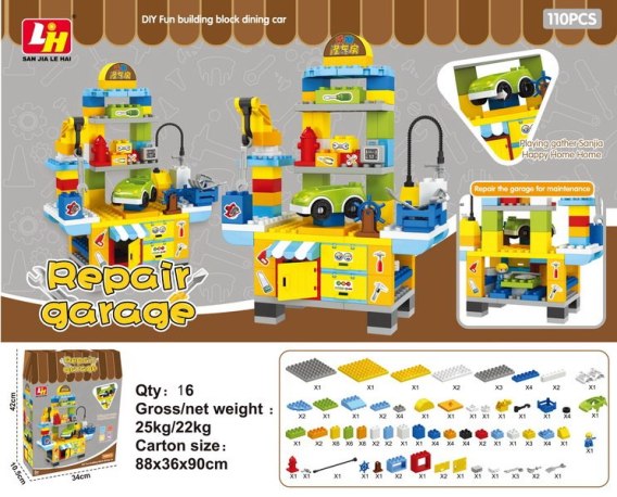 Kreatywny zestaw klocków konstrukcyjnych do budowy warsztatu samochodowego dla dzieci od 3-go roku życia. Zestaw wykonany z najwyższej jakości plastiku w kolorowych barwach. Zestaw zawiera aż 110 elementów, pozwalających na skonstruowanie funkcjonalnego warsztatu samochodowego z pojazdem, narzędziami i sprzętem naprawczym. Wśród sprzętu warsztatowego dzieci odnajdą m.in. takie narzędzia jak śrubokręty czy klucz francuski, a także maszynę do pompowania kół i podnośnik. Zestaw zachęca do kreatywnej zabawy i uczy rozwiązywać problemy.