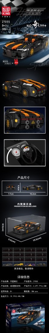 Zestaw 386 klocków konstrukcyjnych do samodzielnej budowy czarno-pomarańczowego samochodu sportowego. Zabawka przeznaczona dla dzieci od 8-go roku życia. Klocki i elementy autka wykonane zostały z wysokiej jakości, wytrzymałego tworzywa sztucznego ABS.