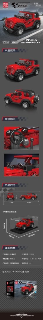 Zestaw 414 klocków konstrukcyjnych do samodzielnej budowy czerwonego samochodu terenowego. Zabawka przeznaczona dla dzieci od 8-go roku życia. Klocki i elementy autka wykonane zostały z wysokiej jakości, wytrzymałego tworzywa sztucznego ABS.
