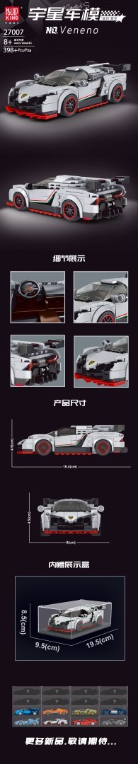 Pojazd posiada ruchomy w górę i dół spojler oraz ruchome imitacje lusterek. W zestawie dołączono instrukcję obrazkową i ochronną gablotę z przezroczystymi ściankami, idealną do ekspozycji. Układanie klocków konstrukcyjnych rozwija u dzieci zdolności manualne, wyobraźnię przestrzenną i cierpliwość.