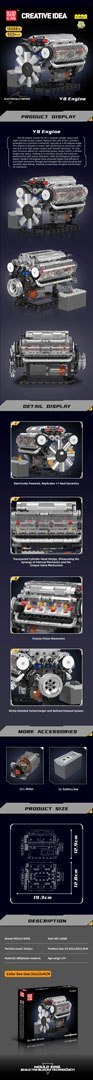 Wysokiej jakości klocki konstrukcyjne Mould King dla dzieci od czternastego roku życia. Zestaw składa się z 552 elementów, z których zbudować można replikę silnika V8 ośmiocylindrowego silnika benzynowego. Ten wspaniały model z pewnością przyciągnie uwagę swoimi detalami. Ruchome elementy dodają mu realizmu. Przezroczysta konstrukcja głowicy cylindrów pozwala na obserwację wewnętrznych mechanizmów: zaworowy, precyzyjny ruch tłoka, szczegółową turbosprężarkę i układ wydechowy. Zestaw wyposażono w silniczek L i boks na baterie 6 x AAA 1,5V (baterii brak w zestawie).