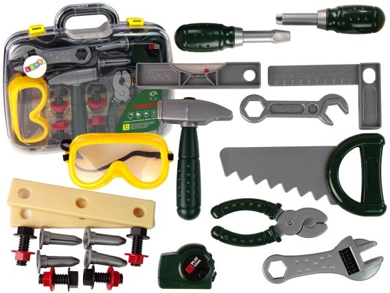 Cały zestaw zamknięty jest w poręcznej walizce. W środku znajdują się narzędzia, w całości wykonane z plastiku. Wszystkie pełnią swoją rolę i pomogą w małych naprawach. Za pomocą śrubokręta maluch będzie mógł przykręcić śrubki. A przy skomplikowanych czynnościach będzie mógł założyć okulary ochronne, dla bezpieczeństwa.
