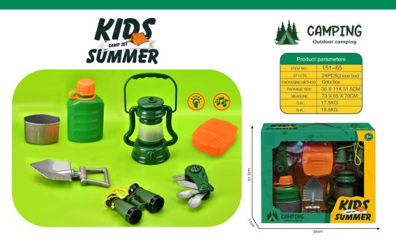 Zestaw małego odkrywcy, dla ciekawych świata dzieci od 3-go roku życia. W skład zestawu wchodzi lampa, lornetka, niezbędnik, manierka, pojemnik na żywność, łopatka. Lampa zasilana jest bateriami typu 3 x AG13 (w zestawie) i posiada oświetlenie.