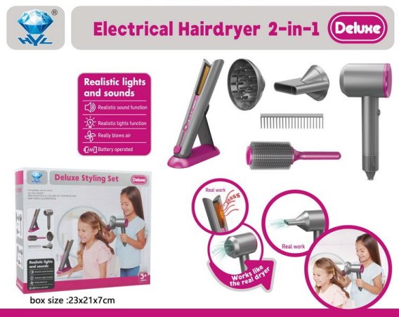 Bogato wyposażony, interaktywny zestaw małej fryzjerki dla dzieci od 3-go roku życia. Zestaw wykonano z dbałością o szczegóły. Znajduje się tutaj suszarka z wymiennymi dyszami, dyfuzorem i nasadką skupiającą, prostownica do włosów, grzebień, szczotka do włosów oraz stojak na prostownicę. Suszarka zasilana jest bateriami typu 2 x AA 1,5 V (brak w zestawie), prostownica bateriami typu 2 x AA 1,5V(brak w zestawie). Suszarka wydaje odgłosy charakterystyczne dla suszenia i posiada delikatny nawiew. Prostownica do włosów, po włączeniu świeci światełkami i wydaje odgłosy charakterystyczne do prostowania włosów.