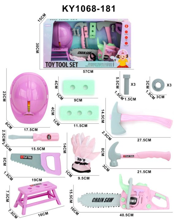Różowy, bogato wyposażony zestaw narzędzi dla dzieci od trzeciego roku życia. Zestaw wykonano z najlepszej jakości tworzywa sztucznego z dbałością o detale. Znaleźć w nim możemy piłę mechaniczną z efektami dźwięku, kask, narzędzia, śrubki, stolik warsztatowy. Idealny zestaw dla małych majsterkowiczów. Piła zasilana jest bateriami 3 x AA 1,5V (brak w zestawie).