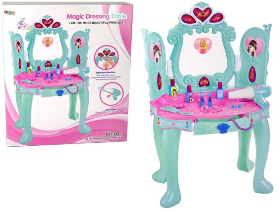 Po dotknięciu przycisku w kształcie serca znajdującego się nad lustrem, zacznie grać przyjazna melodia, a twarz dziecka zostanie oświetlona. Razem z dźwiękiem i światłem, toaletka zacznie się otwierać, ukazując lustro.