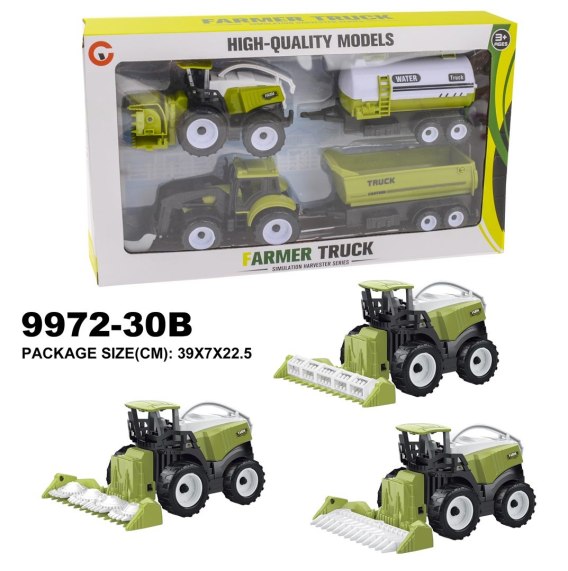 Zestaw pojazdów rolniczych dla dzieci powyżej trzeciego roku życia. Zestaw wykonano z najlepszej jakości plastiku. W zestawie znaleźć możemy kombajn, traktor z pługiem, cysternę oraz przyczepę. Pojazdy zostały wykonane bardzo realistycznie z dbałością o szczegóły i mają wiele ruchomych elementów. Przyczepkę i cysternę możemy doczepiać zarówno do traktorka jak i kombajnu.