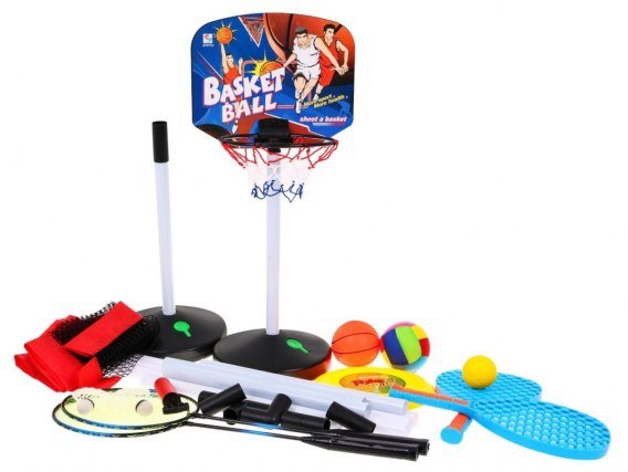Dzięki temu zestawowi można zagrać w koszykówkę, siatkówkę, badmintona, frisbee i paletki.
