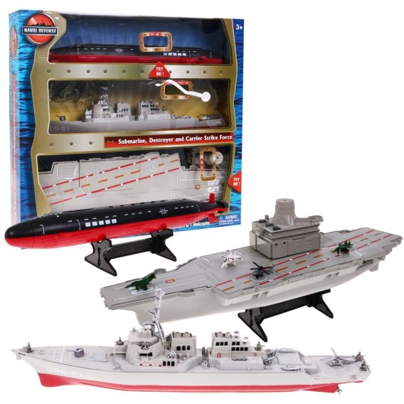 Niesamowity duży zestaw składający się z trzech statków: lotniskowca, łodzi podwodnej oraz niszczyciela. Świetna zabawka dla każdego małego fana marynarki i bitew morskich. W zestawie znajdują się dwie stabilne podstawki, dzięki którym statki będą się pięknie prezentowały na półce. Zabawka posiada efekty dźwiękowe i świetlne. Wieżyczka w lotniskowcu oraz łódź podwodna (dźwięki strzałów, syren, mrugające światełka). Zabawka zasilana jest bateriami typu 2 x AG13 (w zestawie) oraz 2 x AG13(w zestawie). Zabawka przeznaczona jest dla dzieci od 3 - go roku życia i posiada certyfikat CE. Uwaga, zabawka nie nadaje się do wody!!!!