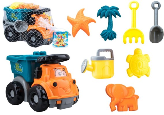 Zestaw zabawek do piasku z pomarańczową wywrotką, która idealnie nadaje się do transportowania piasku i zabawek. W zestawie są 4 foremki, łopatka, grabki i konewka. Jaskrawe kolory przyciągają uwagę dziecka. Wszystkie elementy są trwałe i solidne.