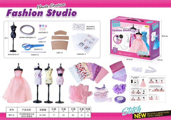 Kreatywny zestaw do projektowania sukienek dla lalek dla dzieci od ósmego roku życia. Zestaw zawiera wszystko, co niezbędne do przygotowania projektu wymarzonej stylizacji aż do wykonania kreacji. Mamy linijkę, kredkę, nożyczki, kolorowe tkaniny, wstążki, naklejki na ubrania, taśmę, falbanki i aż 5 manekinów. Zestaw doskonali manualnie, kształtuje poczucie estetyki, poszerza horyzonty.