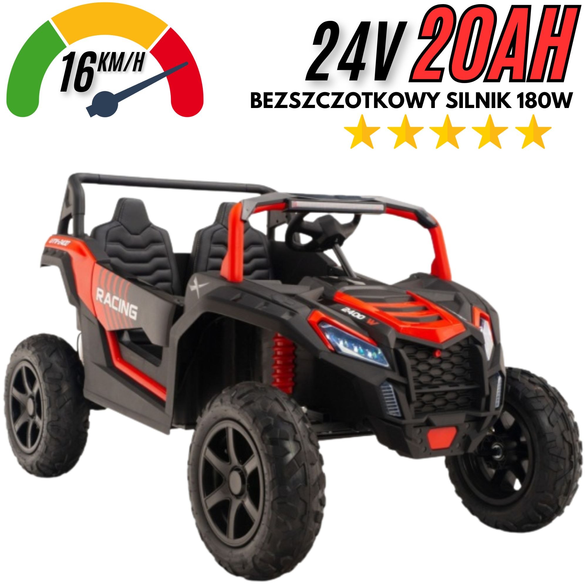 Jeden z największych modeli typu buggy dostępnych na rynku. Cztery mocne silniki, akumulator 24V 21Ah i terenowy design czynią ten pojazd liderem w kategorii moc + styl. Posiada także pilot zdalnego sterowania